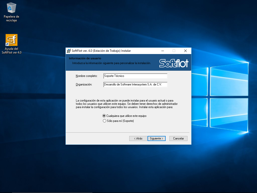 En esta ventana ingresamos el nombre de la persona que utilizará el SoftFlot y la organización o Empresa a la cual pertenece; además de seleccionar si todos los usuarios del equipo puedan ingresar al SoftFlot o únicamente el usuario que se encuentra instalando (esto es opcional), y damos clic en Siguiente.