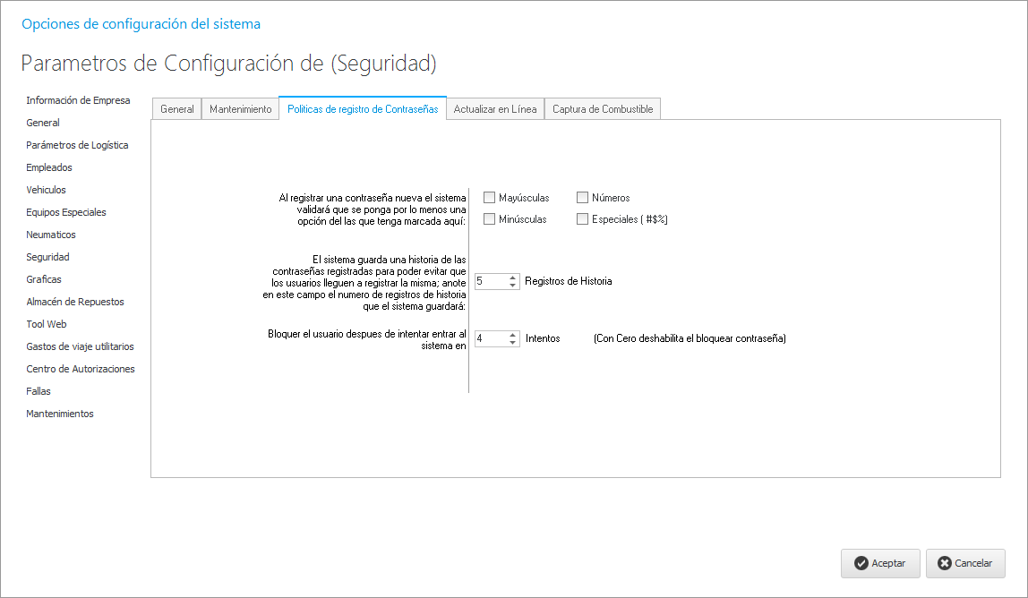 En esta pestaña podemos definir parámetros al generar las contraseñas, cuantos intentos de ingresar e incluso que no se repitan cierta cantidad de contraseñas.