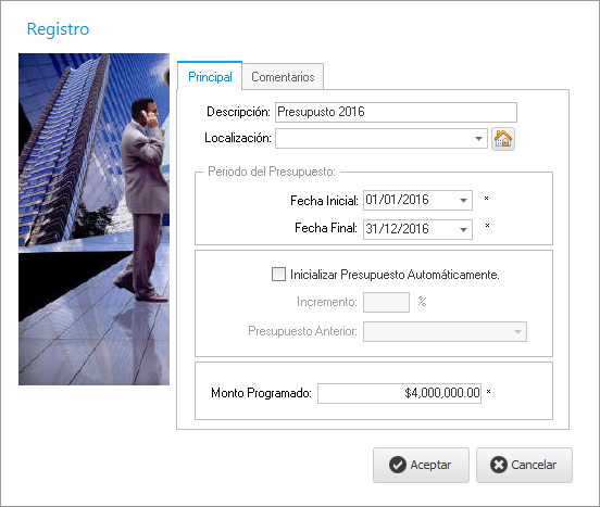 3. Agregar, como lo muestra en la siguiente imagen, un presupuesto general autorizado por la empresa que puede ser en cualquier rango de fecha, si fuera anual solo podemos como fecha inicial el primer día del año y como fin el último. Para abrir esta ventana se debe de dar clic en el botón debajo de la pestaña