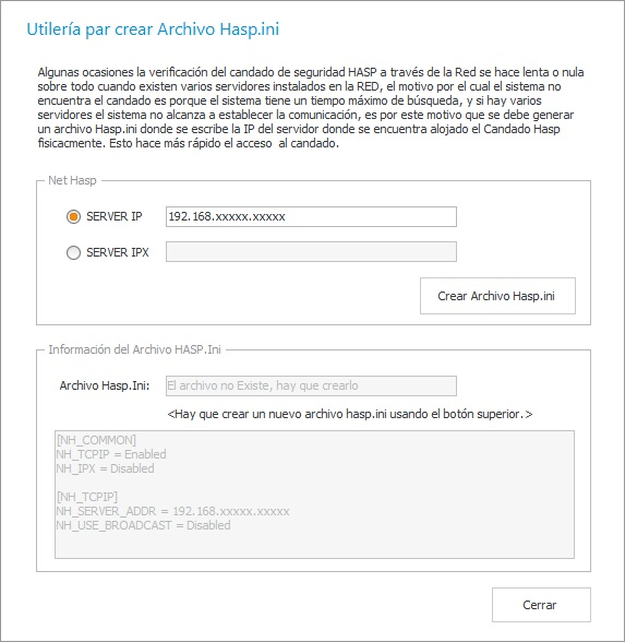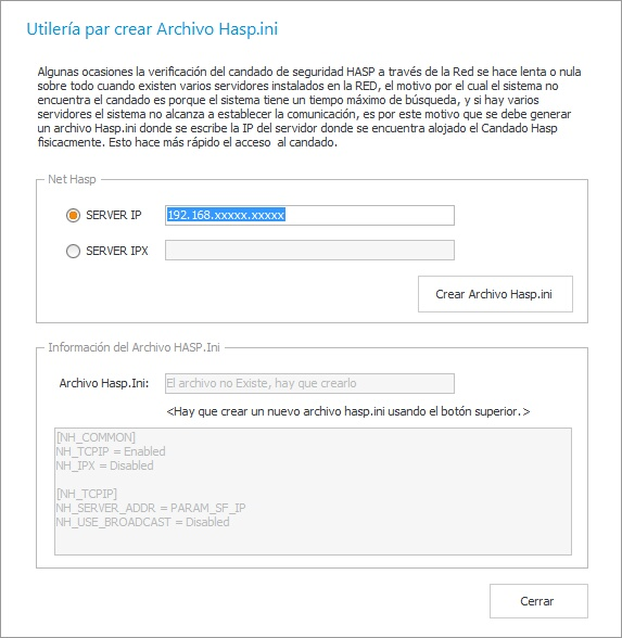 Otro caso se da cuando se tienen instalados varios Servidores esto puede afectar el tiempo de espera que tiene el sistema para encontrar el dispositivo HASP, debido a que lo busca de Servidor en Servidor. Una forma de resolver esto es creando un archivo Hasp.ini que puede ser generado por una herramienta llamada [Generador de Archivo Hasp.ini] que se instala en las Estaciones de Trabajo desde el [Menú Inicio\Software Interasystem].