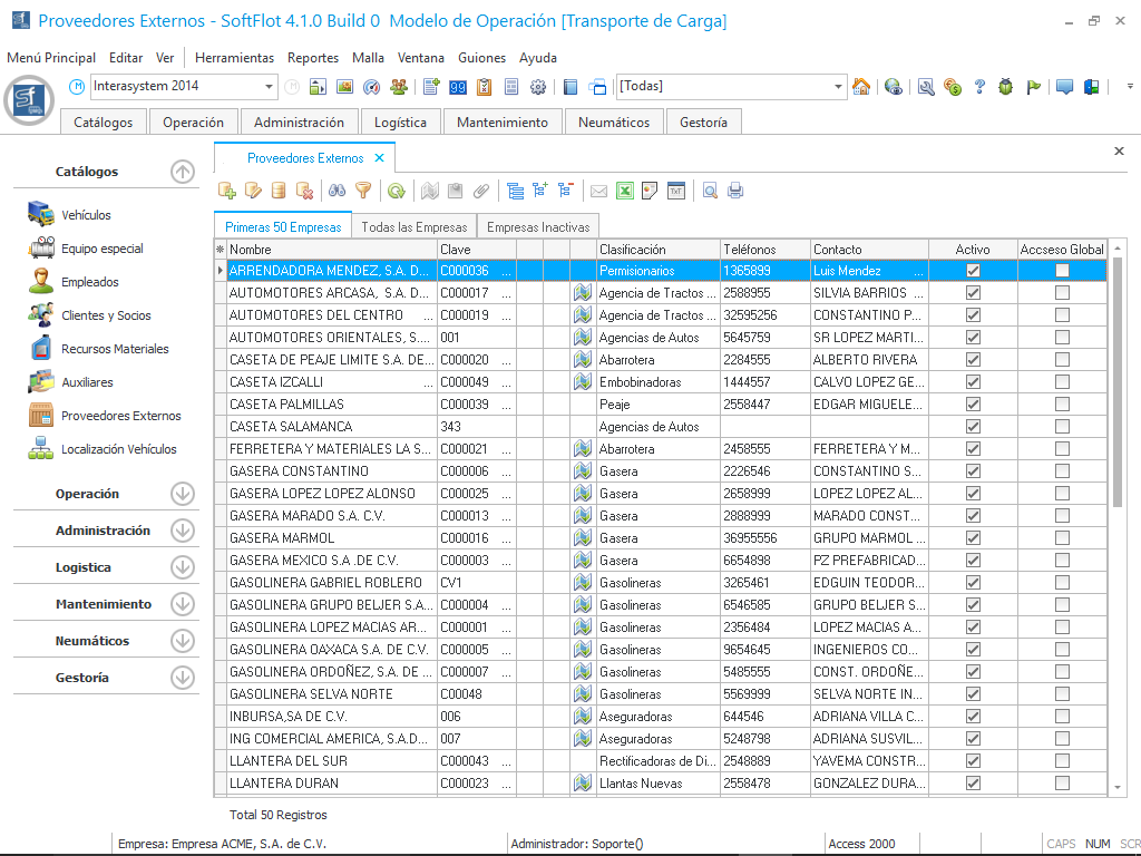 En esta sección se lleva el registro de la información de cada una de las empresas que nos prestan algún tipo de servicio, relacionados con algún módulo que lo requiera como es el caso de mantenimiento, seguros etc. A continuación explicaremos algunos de los mas importantes campos que se requieren registrar en este módulo, es muy importante tomarlos en cuenta ya que de aquí depende el buen funcionamiento del sistema.