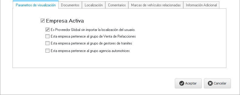 Aquí configuramos tanto la visualización de la empresa, si es global o únicamente a la localización a la que pertenece; además la pertenencia de la empresa, es decir, si es una empresa de venta de refacciones, de gestor de tramites o agencia automotriz. De esta manera lo podremos visualizar en los diferentes módulos del SoftFlot.
