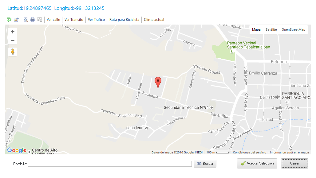 Aquí ingresamos la ubicación de la empresa cliente o socia, de manera satelital; al dar clic en Buscar nos mostrará un mapa como el que se muestra al final.