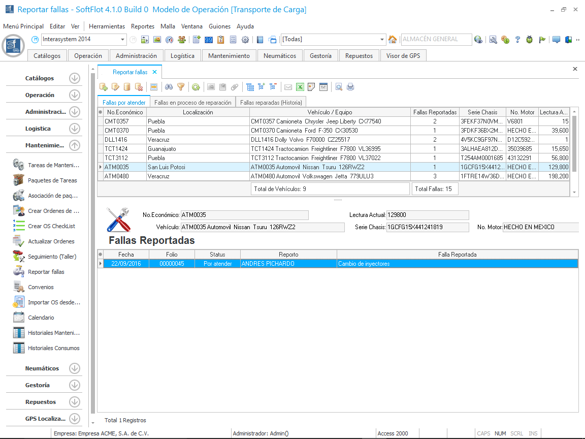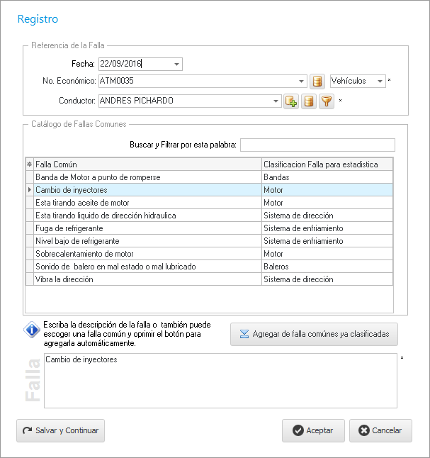 Al hacer clic nos muestra la siguiente ventana en donde seleccionamos la fecha del reporte, el vehículo o equipo al cual se realiza el reporte, el conductor quien reporta la falla y al final del catálogo de fallas comunes, previamente asociada en Paquetes de tareas, seleccionamos la falla que reporta el conductor o la ingresamos directamente en la parte inferior de la ventana como se indica a continuación.