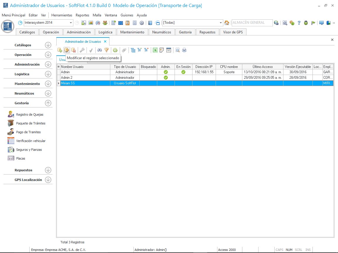 Al crear un usuario, definimos los permisos de las operaciones que puede realizar en los módulos del SoftFlot; adicionalmente a esto, podemos definir roles adicionales. Estos roles pueden ser: Autorizar Siniestros, Autorizar Salidas de Vehículo, Autorizar Ordenes de Servicio, Restricción de Campos, etc.