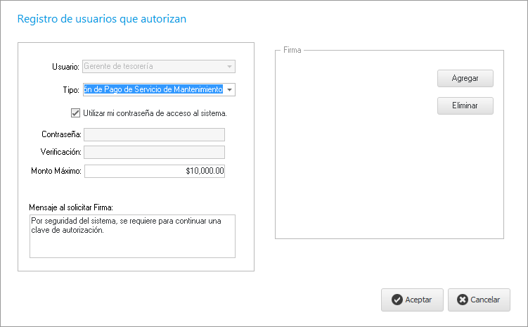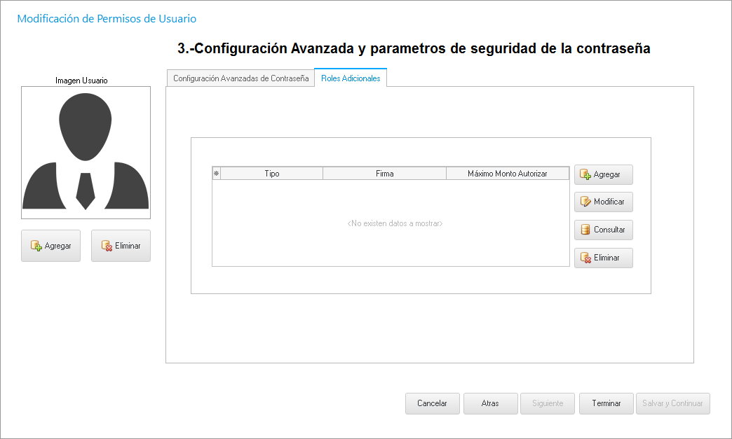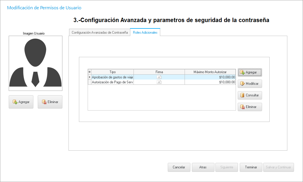 En esta ventana, hacemos clic el botón para abrir la ventana en donde seleccionaremos el rol adicional, además podemos agregar un documento con la firma de la persona quien realizará estas autorizaciones y el monto máximo que puede autorizar como se muestra en la siguiente imágen.