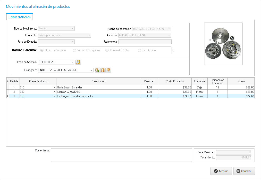 En este caso seleccionamos Orden de Servicio, ahora debemos de seleccionar una OS que tenga materiales agregados; al hacerlo nos muestra de manera automática con las cantidades de repuestos solicitadas y los costos agregados en la OS. También podemos indicar a que persona se entregarán estos repuestos.