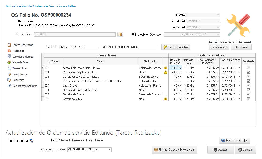 Al hacer clic nos muestra la misma ventana que en el módulo de Actualizar Ordenes por lo cual el procedimiento es exactamente el mismo, el único cambio sería ingresar la fecha y hora de termino en la parte inferior de la ventana.