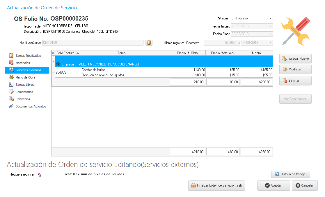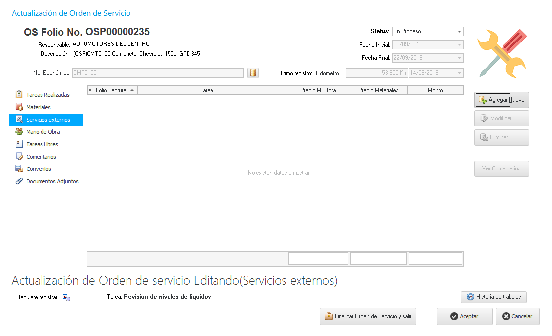 El SoftFlot también nos permite generar OS realizadas por algún taller externo, para ello debemos seleccionar la pestaña "Servicios externos" y damos clic en el botón como se muestra en la siguiente imagen.
