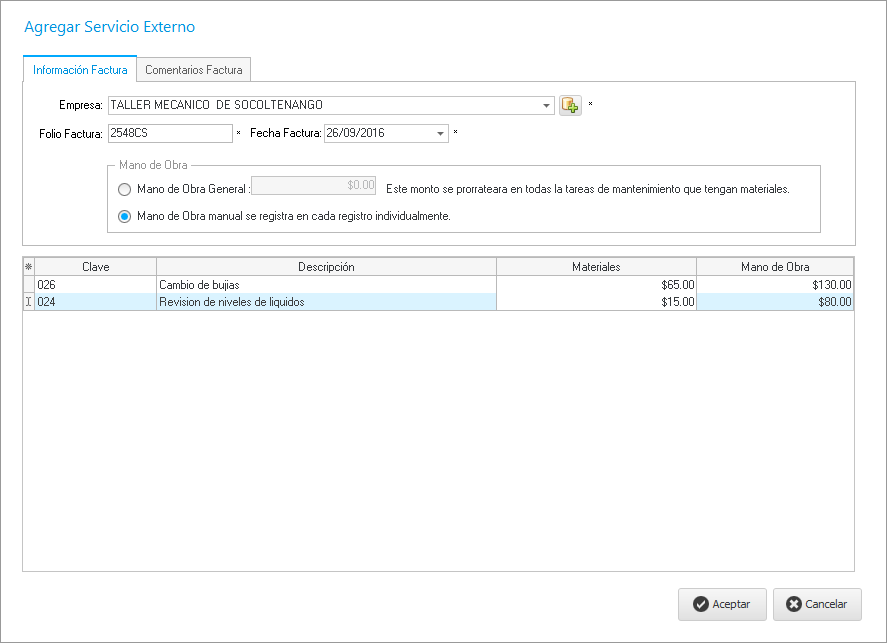 Al hacer clic, nos muestra la siguiente ventana en donde primeramente seleccionaremos la empresa que nos realizará este servicio (Proveedor Externo), ingresamos el folio de factura y la fecha de la factura.