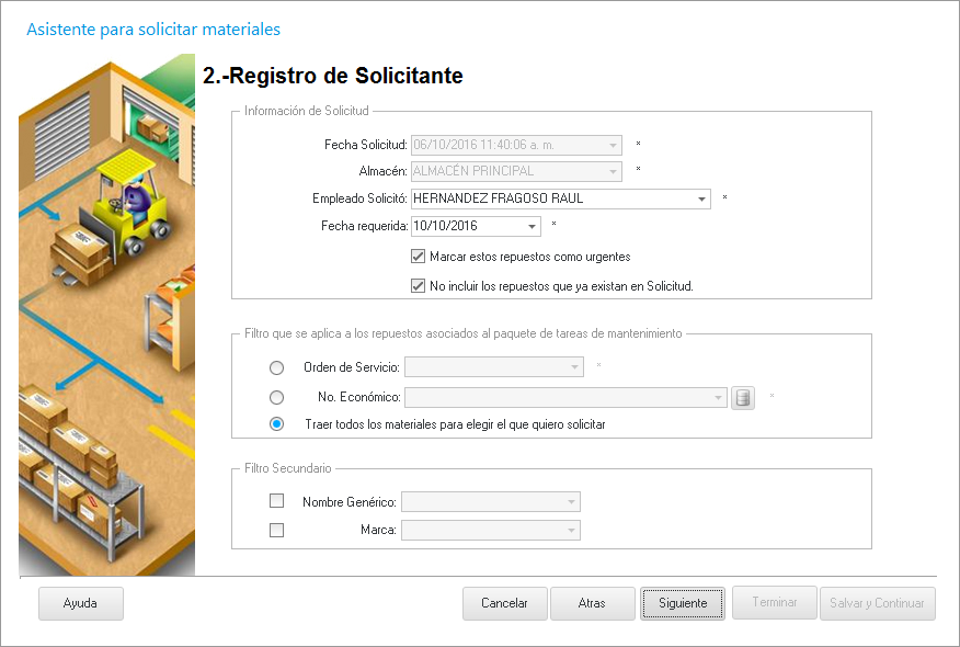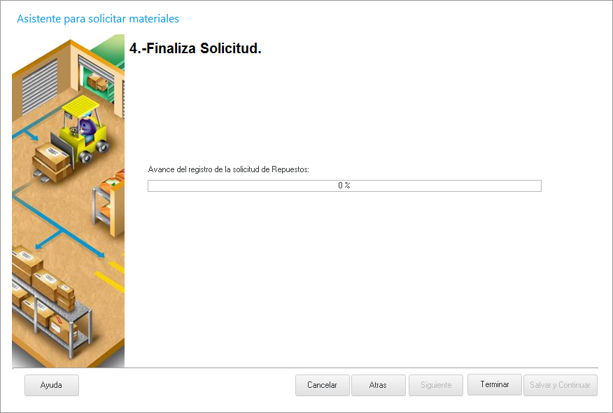 Para el ejemplo utilizaremos el asistente, y al hacer clic en el botón nos mostrará la siguiente ventana en la cual decidiremos una de las siguientes dos opciones para realizar la solicitud de repuestos.