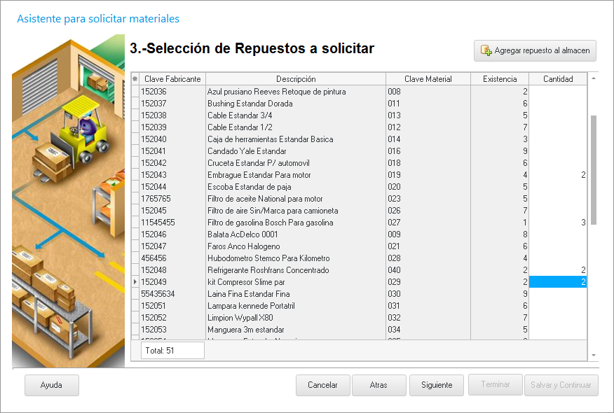 Hacemos clic en siguiente y, conforme a la información ingresada en la ventana anterior, nos muestra los repuestos que cumplen con los criterios de búsqueda. En esta ventana nos muestra las existencias actuales de nuestro Catálogo de Productos y directamente en la malla de información podemos agregar la cantidad de cada repuesto que deseamos solicitar.