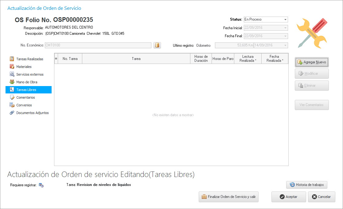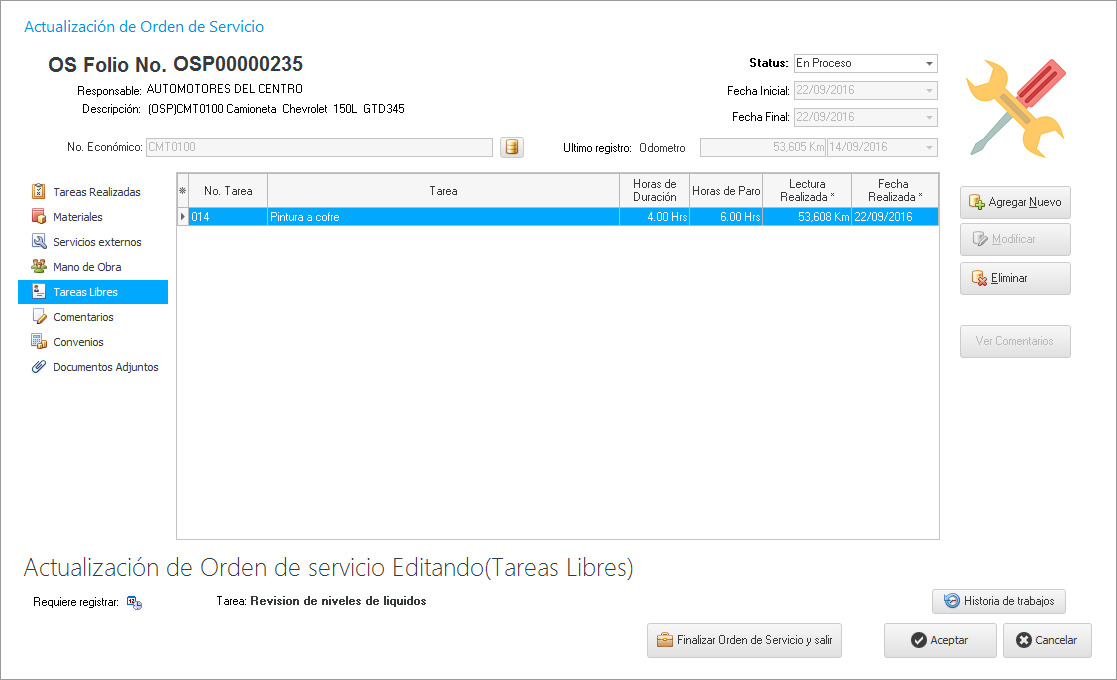Si hacemos clic en Si, nos muestra la información del registro asociando la nueva tarea o falla reportada a esta OS.