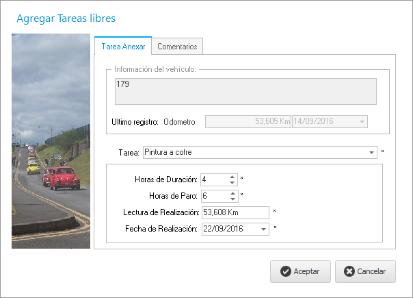 Al hacer clic, nos muestra la siguiente ventana en donde seleccionaremos la tarea adicional que se realizará, estas tareas pertenecen al paquete de tareas asignado al vehículo y son tareas libres y de reporte de fallas; después ingresamos las horas de duración, las horas de paro, la lectura del medidor cuando se realizó y la fecha.