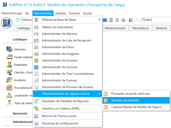 Con ayuda de esta herramienta, podemos actualizar los trámites en Gestoría de manera masiva por concepto de trámite. Para abrir esta opción, debemos de ir al menú [Herramientas \ Administrador de captura masiva \ Trámites de Gestoría] como se muestra a continuación.