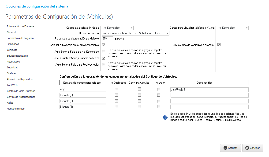 Además, definir el porcentaje de depreciación por defecto, folios; y poder definir las características de los cuatro campos personalizables con los que cuenta el módulo de Catálogo de Vehículos.