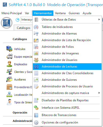 Con la ayuda de esta herramienta, podemos realizar movimientos en la lectura de los vehículos y equipos. Para abrir esta opción, debemos de ir al menú [Herramientas \ Administrador de Lecturas] como se muestra a continuación.