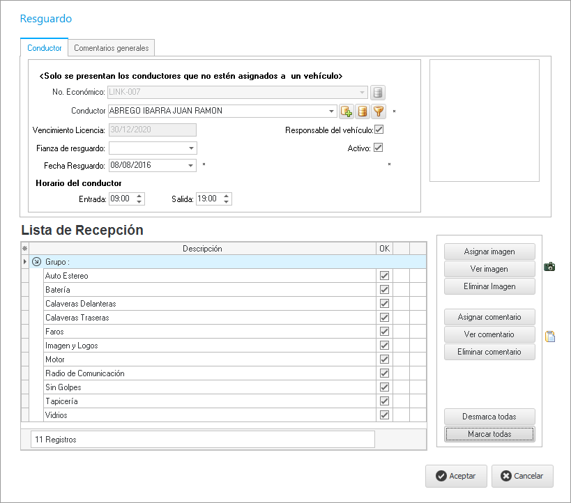 Al dar clic en el botón , abrirá la siguiente ventana en la cual definiremos al responsable del vehículo, la fecha en la cual se realizó el resguardo y verificar que los componentes del vehículo desde una lista de recepción, definida en la herramienta Administrador de Lista de Recepción.
