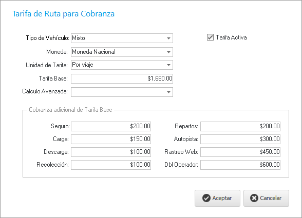 Podemos agregar costos adicionales como lo son, seguros, cargas, descargas, doble operador, rastreo, etc.