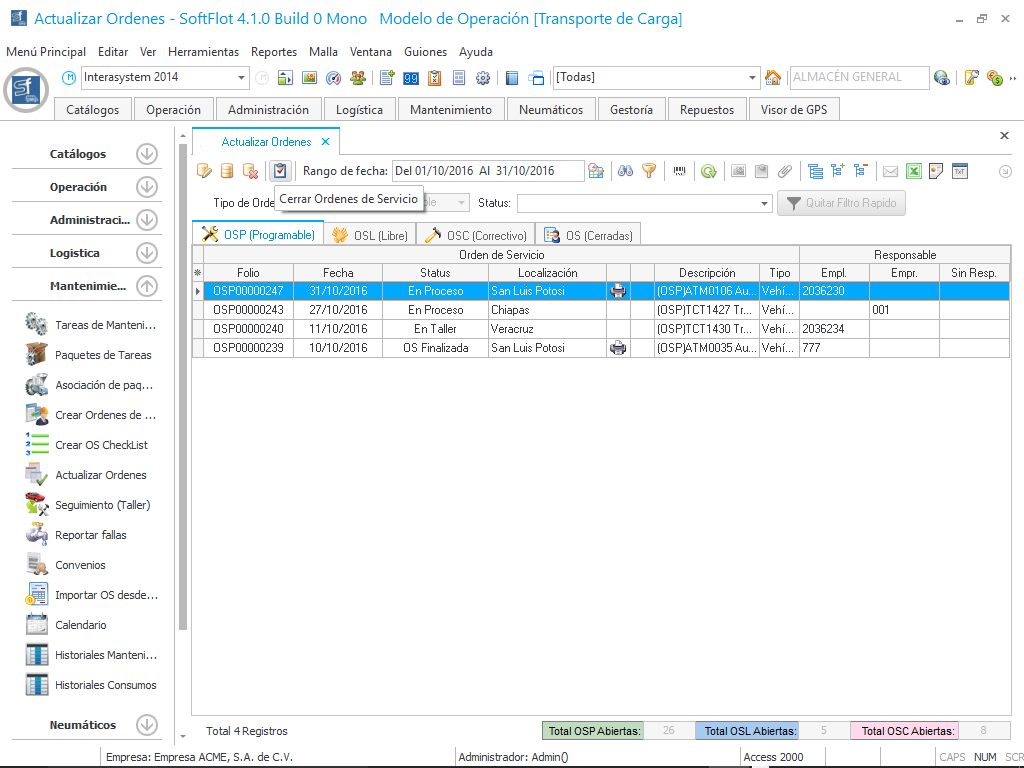 Al hacer clic en Si, cierra las ventanas y en la malla principal de datos la OS ahora tiene el estatus de OS Finalizada. Al estar en este estatus ya no podemos hacer modificación alguna pero aún no se encuentra totalmente cerrada.