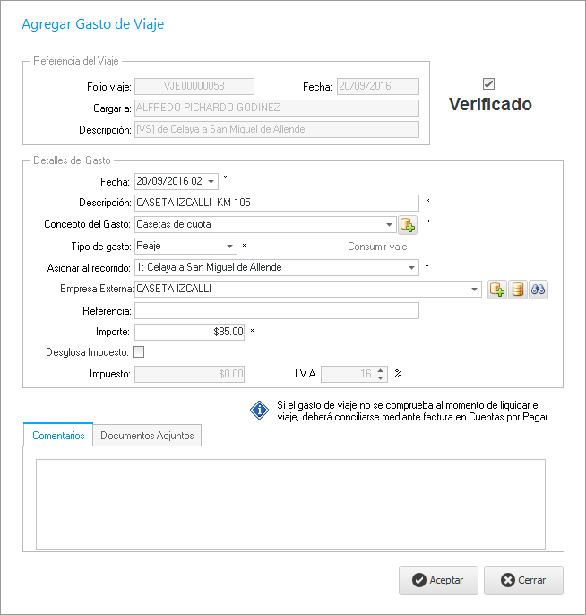 - Marcar como verificado el concepto, si es que se valida el gasto.