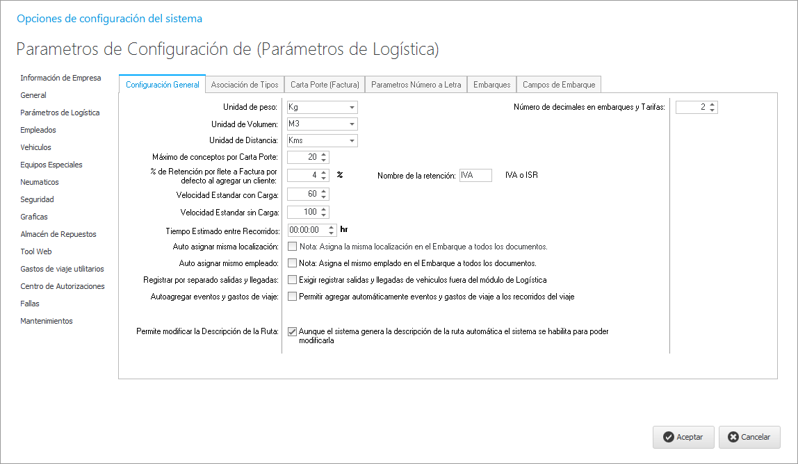 En esta pestaƱa, como lo indica el nombre, realizaremos las configuraciones generales que se requieren al momento de crear un nuevo embarque, al generar un viaje y cuando este termine.
