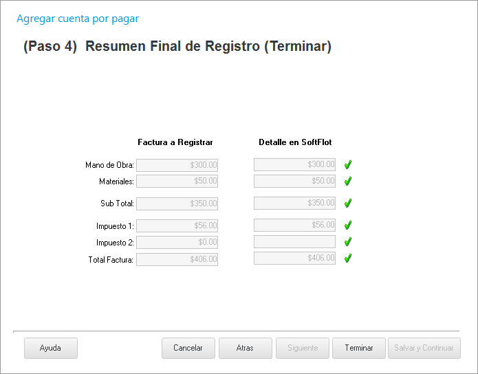 Y en esta última ventana validaremos tanto la información de costos de la Orden de Servicio como la que se Ingresó en el paso 3 del asistente. Aquí damos clic en Terminar para finalizar la creación del folio a pagar.