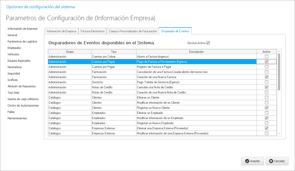 En esta pestaña definimos si activamos o no el disparador de eventos el cual permite la interacción con otro software con el cual se haya creado una interface junto con la herramienta Visor de eventos Disparados el cual nos permite ver los eventos realizados. Aquí también podemos marcar que información deseamos que reciba el otro software mediante esta interfaz.