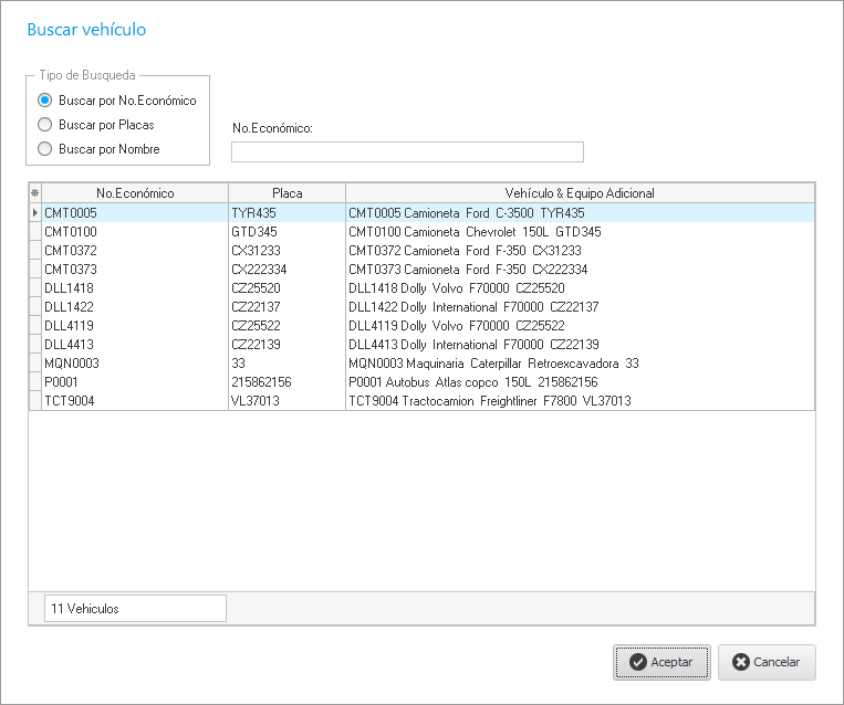 Únicamente aparecerán en la lista los vehículos que en Agregar