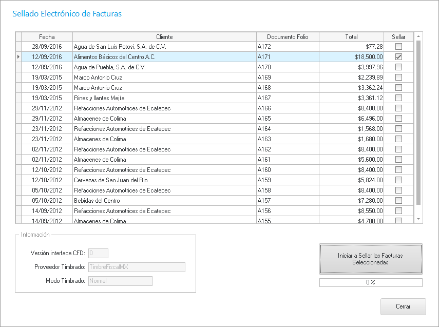Al hacer clic nos muestra una ventana en donde de manera automática aparecerá marcada la factura que seleccionamos en la malla, aquí solo hacemos clic en el botón "Iniciar a Sellar las Facturas Seleccionadas" como se muestra en la imagen.