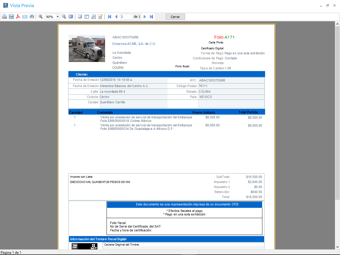 Al hacer clic en Imprimir, nos muestra una vista previa de la factura seleccionada y se guardará en la carpeta que definimos en la pantalla donde cargamos los certificados.