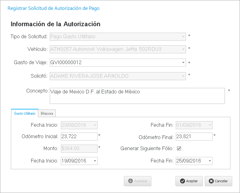 Una vez dado clic, nos abrirá la siguiente ventana en donde seleccionaremos el folio del gasto de viaje, el concepto, agregado una bitácora (documento adjunto) en la pestaña Bitácora, la lectura inicial y la final del vehículo; y tenemos la posibilidad de abrir el siguiente folio de viaje asignando el mismo conductor, vehículo y las fechas de inicio y fin.