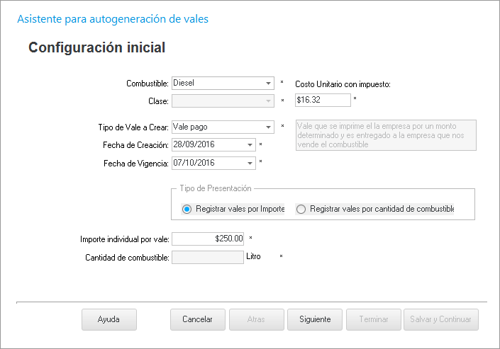 - Tipo de Vale a Crear, (pre-pago, pos-pago)