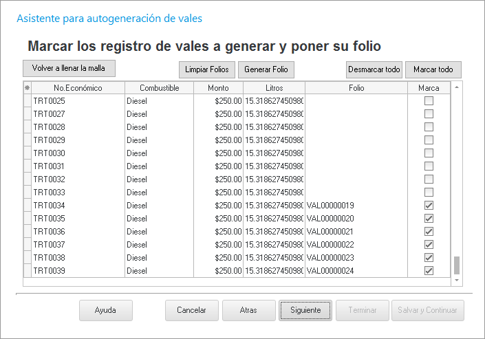 Primero.- Debemos de marcar la casilla de la parte derecha a los vehículos que deseamos generar folios de vales.