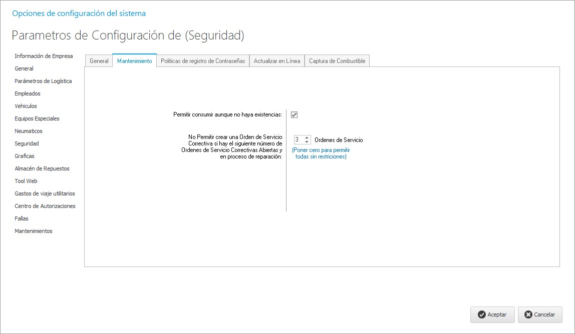 En esta pestaña podemos seleccionar la cantidad de OSC abiertas simultaneamente sobre el mismo vehículo y si permitimos realizar consumos de repuestos aunque no haya existencias en el almacén.