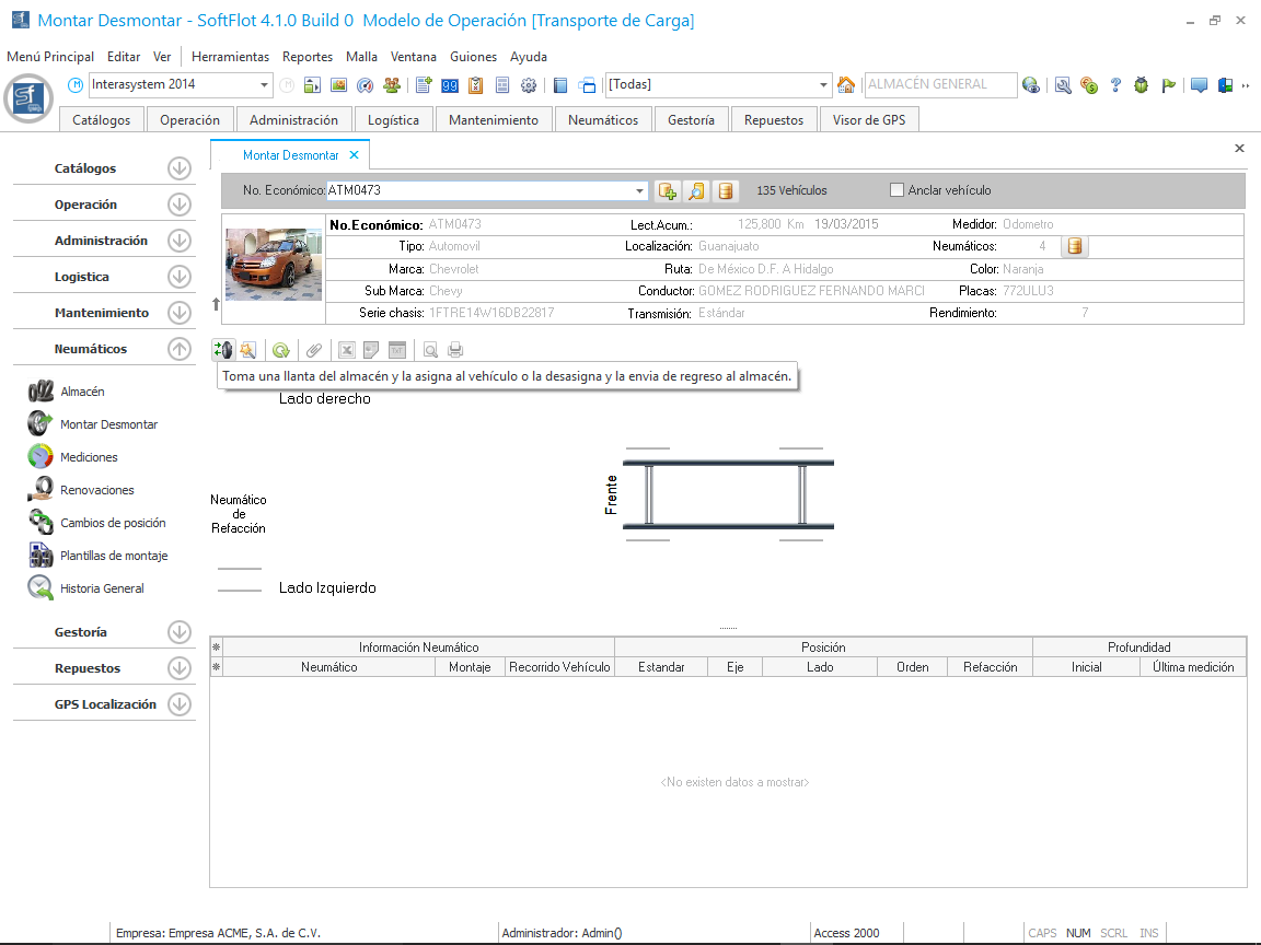 En este módulo se lleva a cabo el montaje y desmontaje de Neumáticos a cada vehículo de la flotilla, para montar un Neumático debemos de seleccionar un vehículo en la sección , al seleccionarlo nos muestra la plantilla de la estructura y los ejes del vehículo, además nos muestra si tenemos la posibilidad de asignar neumáticos de repuestos.