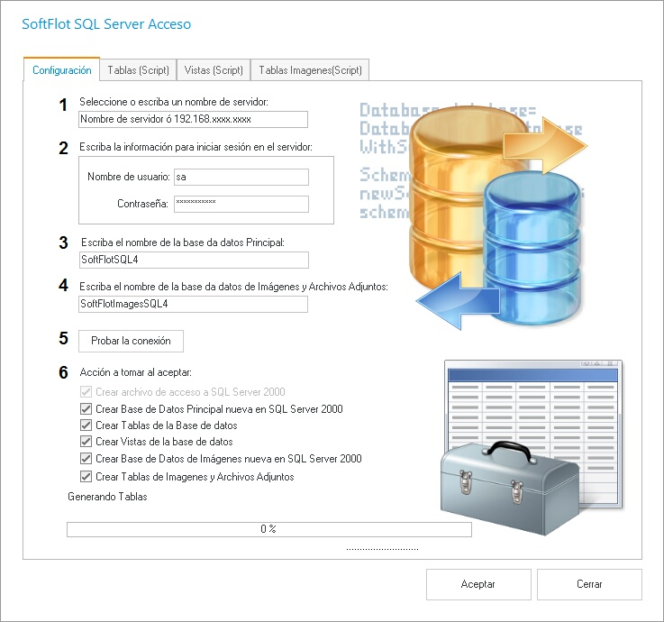 Aquí seleccionaremos las acciones que realizará el asistente al dar clic en Aceptar; para la creación de toda la base de datos de SoftFlot es necesario seleccionar todas las opciones mostradas aquí.