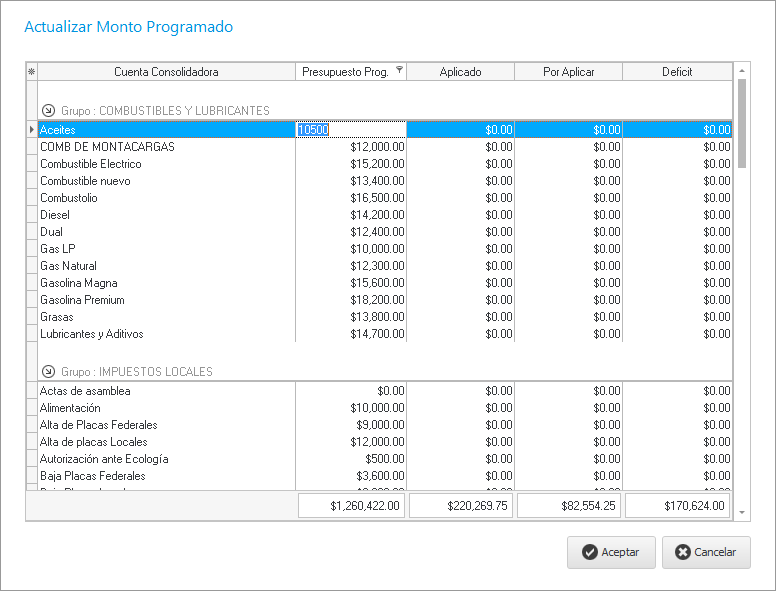 4. Después de agregar el presupuesto el sistema agrega el grupo de cuentas consolidadoras en la malla principalen la cual por medio de el botón para abrir la siguiente ventana en la cual ingresaremos los presupuestos programados para cada cuenta de consolidación. De esta manera al hacer un gasto asociado a una cuenta de consolidación, las columnas de [Aplicado], [Por Aplicar], [Déficit] se actualizarán de manera automática.