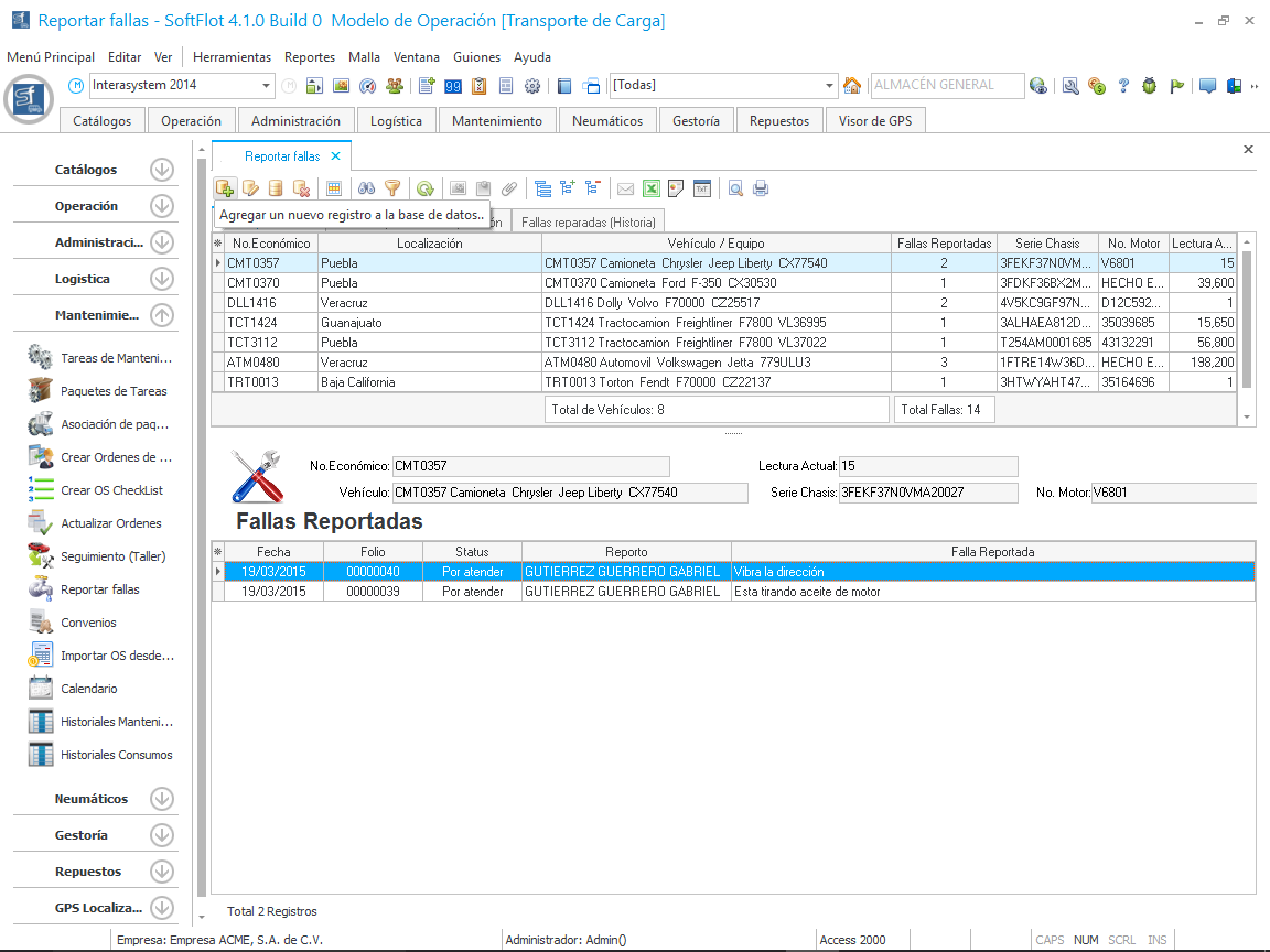 Al hacer clic nos muestra la siguiente ventana en donde seleccionamos la fecha del reporte, el vehículo o equipo al cual se realiza el reporte, el conductor quien reporta la falla y al final del catálogo de fallas comunes, previamente asociada en Paquetes de tareas, seleccionamos la falla que reporta el conductor o la ingresamos directamente en la parte inferior de la ventana como se indica a continuación.