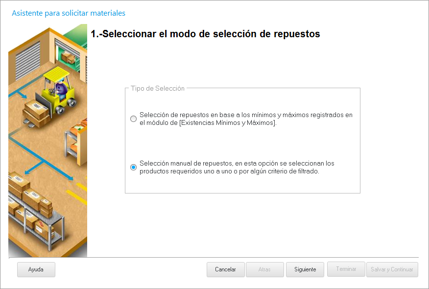 Para el ejemplo utilizaremos el asistente, y al hacer clic en el botón nos mostrará la siguiente ventana en la cual decidiremos una de las siguientes dos opciones para realizar la solicitud de repuestos.