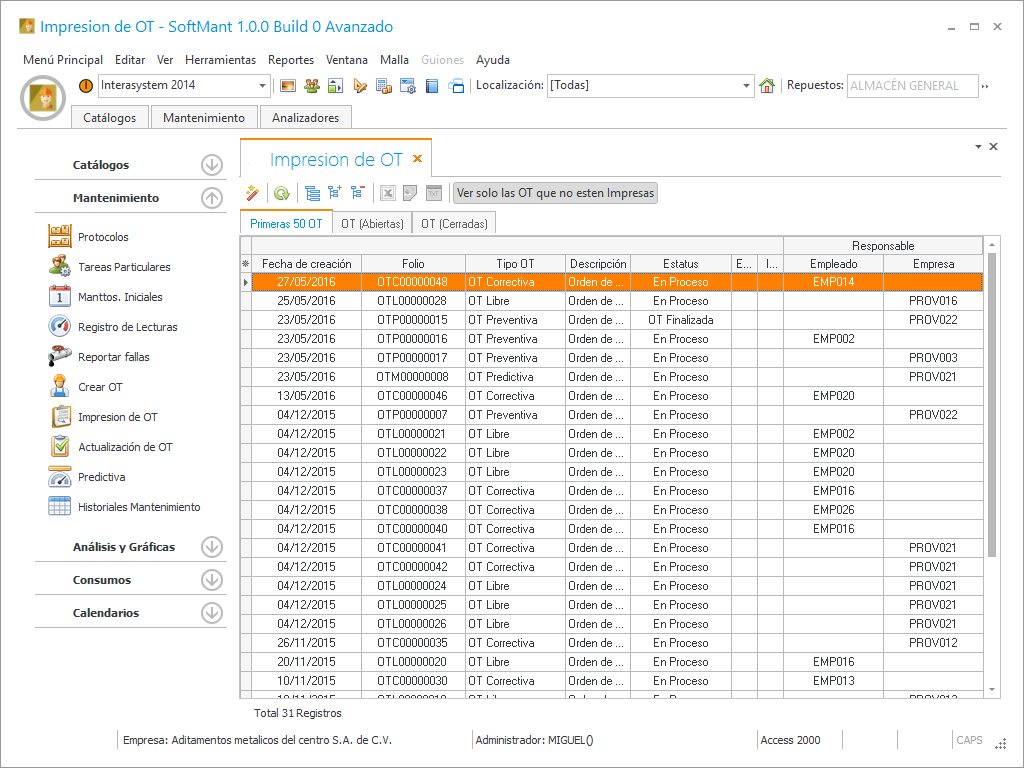 En este módulo se imprimen y se actualizan las Ordenes de trabajo que fueron generadas en crear OT (ordenes de trabajo).