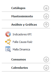 En analisis y graficas tenemos indicadores KPI, Falla Causa Raiz y Malla Dinamica.
