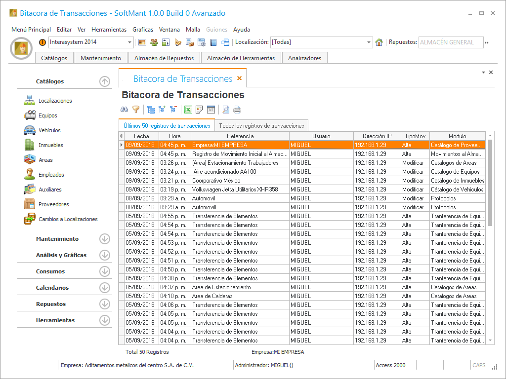 En la Bitacora de transacciones podemos ver todas las operaciones que hemos realizado en el sistema, cualquier proceso que realizemos sera registrado para tener un historial. Se encuentra en [Herramientas].