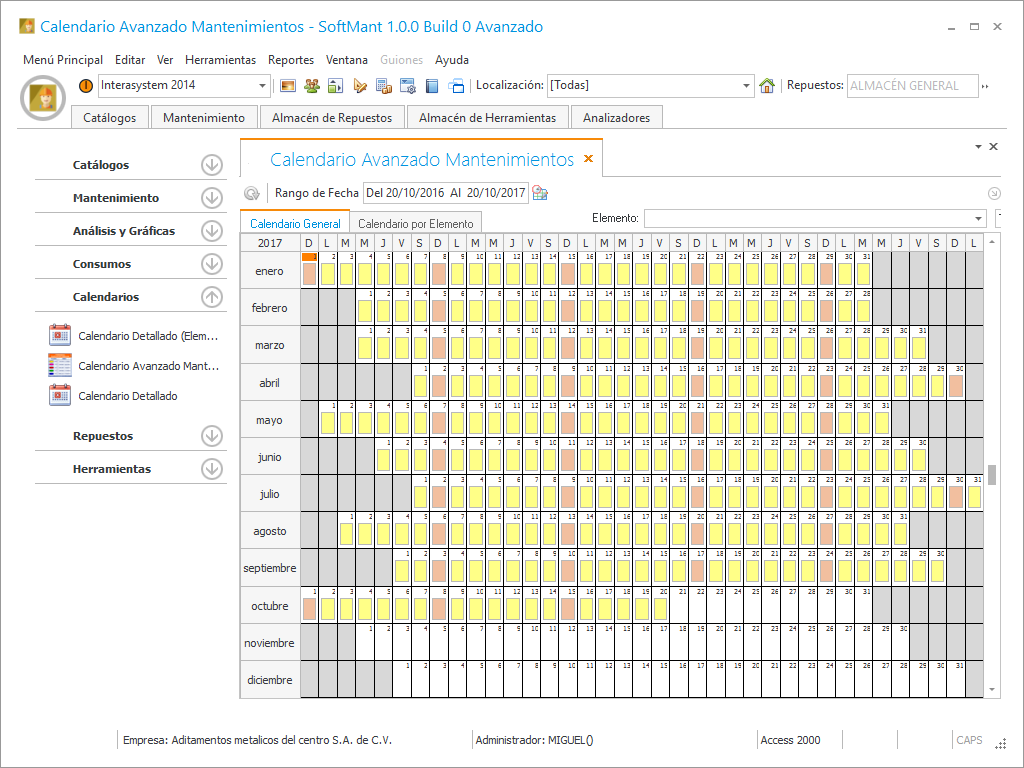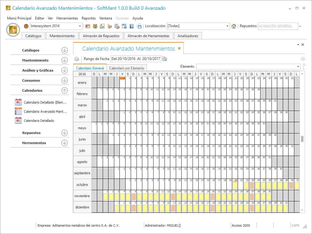 Al darle doble clic al circulo color amarillo nos aparecerá una ventana que nos muestra la Tarea Programada para ese día. También podemos ver todas las tareas, sus fechas programadas y a los elementos que se le dará mantenimiento.