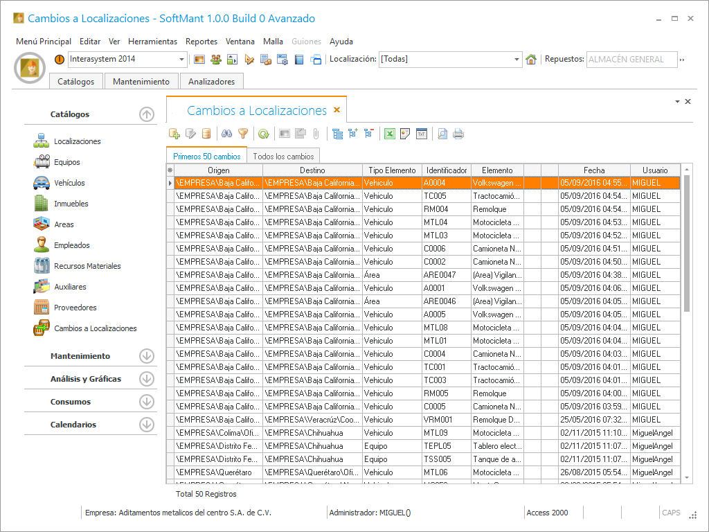 El catálogo de cambios de localizaciones podemos realizar movimientos de traslados de cualquier elemento de la estructura de nuestra empresa a otra parte, como por ejemplo tenemos un equipo que lo vamos a llevar a otra área, lo que tenemos que hacer es seleccionar la familia de equipo de una lista de opciones, también debemos elegir la localización destino y finalmente elegir el equipo que vamos a cambiar.