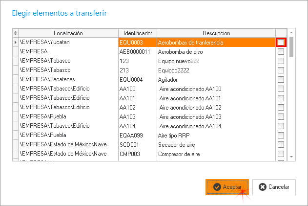 Haga clic en este botón y nos aparecera una ventana Emergente llamada Elegir Elementos a Transferir y en ella podra elegir los elementos que necesita cambiar a otra localización.