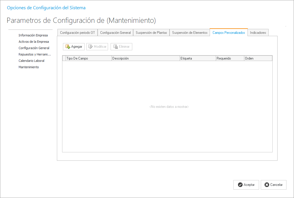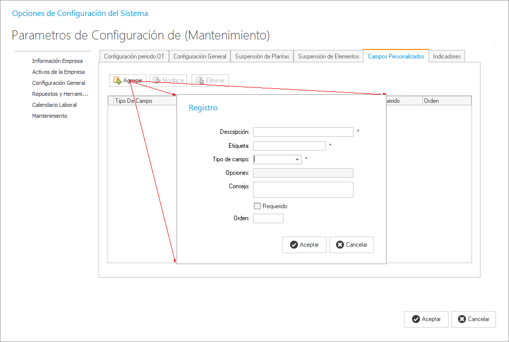 En el caso de que SoftMant no se encuentra un campo en la información de la OT´s podemos crearlo en esta pestaña, agregando la descripción, el tipo de dato, si va ser requerido, etc. El campo personalizado que creamos nos aparecerá en el modulo [Actualización de Ordenes] para agregarle la información correspondiente.