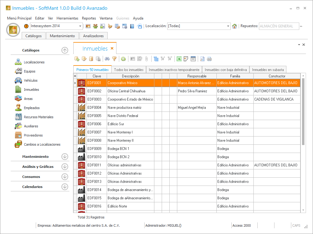 En este módulo se registra la información general de los inmuebles que tenemos en nuestra empresa. Esta es la ventana principal del módulo de [Catálogo de inmuebles] donde a continuación mostraremos algunos botones de uso particular para este.
