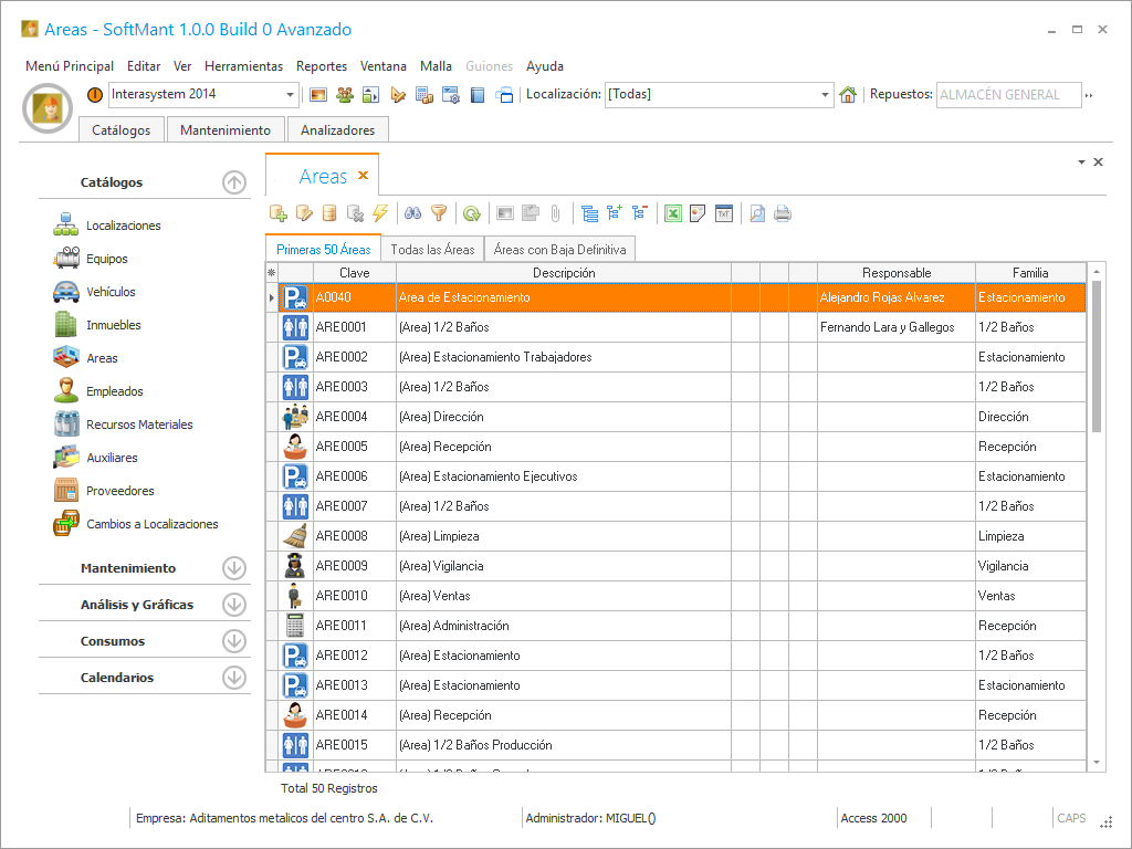 Esta es la ventana principal del módulo de [Catálogo de áreas] donde a continuación mostraremos algunos botones donde Agregara, modificara y registra de forma masiva. Haga clic en y le permitira Agregar Áreas para la captura másiva de áreas haga clic en y le muestra la Captura rapida de elementos donde registrara varias áreas con su información básica, para actualizar datos haga clic en y le mostrara una ventana donde podrá Modificar Áreas.
