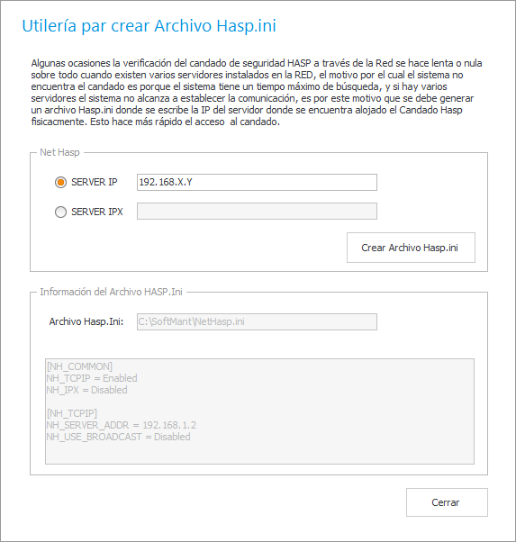 Otro caso se da cuando se tienen instalados varios Servidores esto puede afectar el tiempo de espera que tiene el sistema para encontrar el dispositivo Hasp, debido a que va buscando de Servidor en Servidor. Una forma de resolver esto es creando un archivo Hasp.ini que puede ser generado por una herramienta llamada [Utilería de Instalación e información] que se instala en las Estaciones de Trabajo.